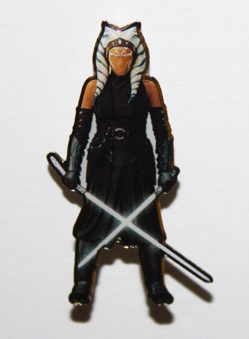 This new, unused enamel metal pin features the image of the Jedi Ahsoka Tano with her dual lightsabers on and crossed as seen in various Star Wars TV series. It measures 2″ high x 1.125″ wide, has been stored in a smoke and pet free environment and comes with two clutch back pins for attachment.