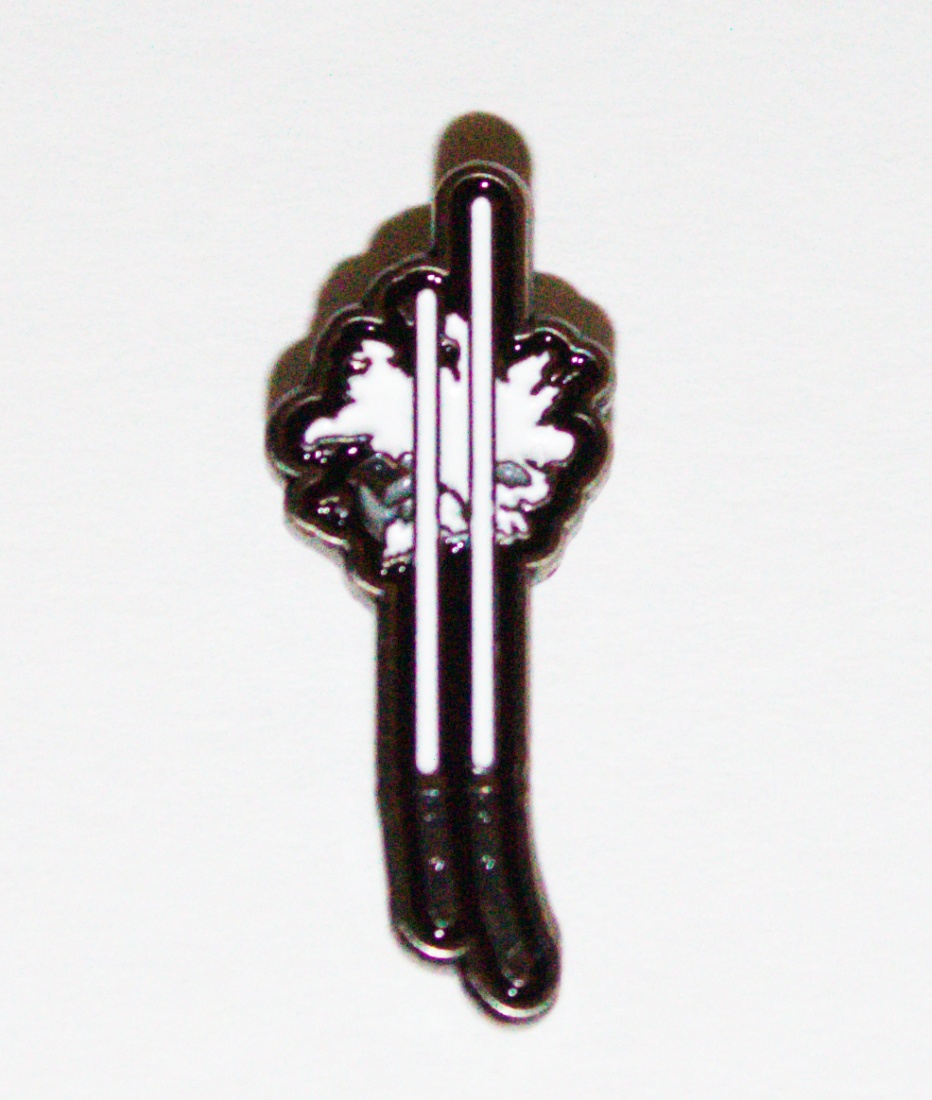This new, unused embossed metal pin features the image of the dual lightsabers used by Jedi Ahsoka Tano as seen in various Star Wars TV series. It measures 1.25″ high x 7/16″ wide, has been stored in a smoke and pet free environment and comes with two clutch back pins for attachment.