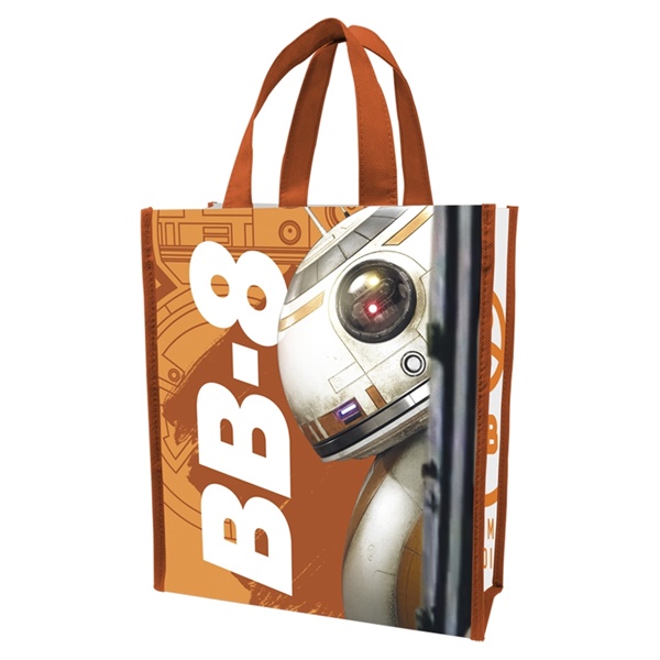 Featuring images of Astromech Droid BB-8 from the Star Wars movie Episode VII: The Force Awakens, is this two-sided recycled shopper tote that is earth-friendly (made of 25% recycled materials), strong and water resistant. Great for shopping and a good alternative to a traditional gift bag. It measure 10″ x 4.5″ x 12″ with a strap that features a 6.5″ drop. You can wipe clean with a damp cloth. This is a new, unused tote stored in a smoke and pet free environment.