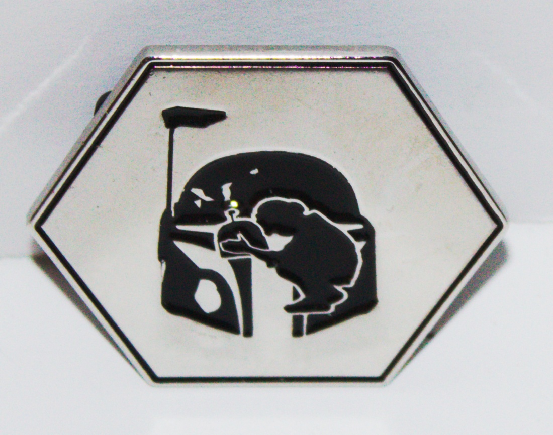 This new, metal enamel pin that features the silhouette image of a young Boba Fett holding his fathers (Jango Fett) helmet after he was killed in a scene from the Star Wars movie Episode II: Attack of the Clones. It measures 1.75″ high x 2″ wide, has been stored in a smoke and pet free environment.