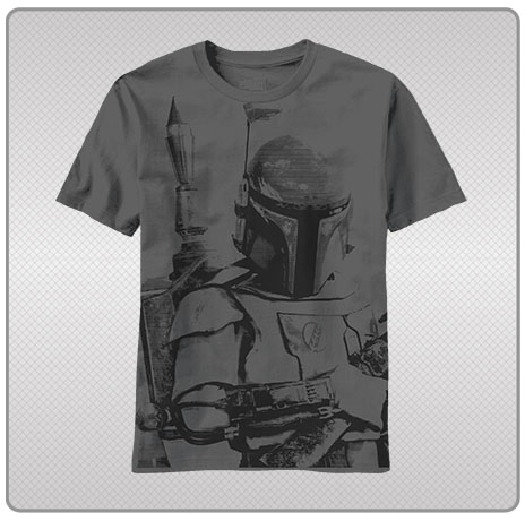 This is a charcoal t-shirt that features the body print image of the bounty hunter Boba Fett and titled Sarlacc Bait. This is a new, unused, 100% cotton t-shirt.