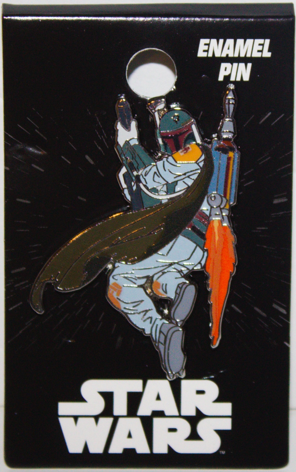 This new, unused enamel metal pin features the die-cut image of Boba Fett flying with his jet pack as seen in various Star Wars movies and TV series. It measures 2″ high x 1.25″ wide, has been stored in a smoke and pet free environment and comes with a clutch back pin for attachment.