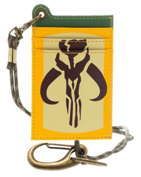 This is an id/credit card vinyl wallet with a nylon parachord to attach to your belt or even hold keys, or even wear as a lanyard, that has the image of the Mandalorian armor logo on the front (the maker of Boba Fetts armor) and the Star Wars name on the back, from the classic Star Wars movies. It is a new, unused wallet stored in a smoke and pet free environment.
