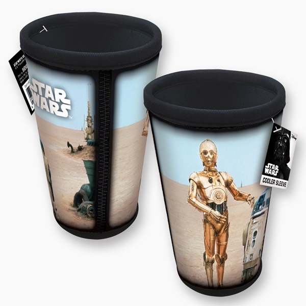 This is an illustrated insulated black neoprene sleeve style drink glass/travel mug cooler huggie koozie featuring a scene of the Droids R2-D2 and C-3PO on Tatooine from the first classic Star Wars movie Episode IV: A New Hope. It is a new and unused licensed can cooler stored in a smoke and pet free environment.