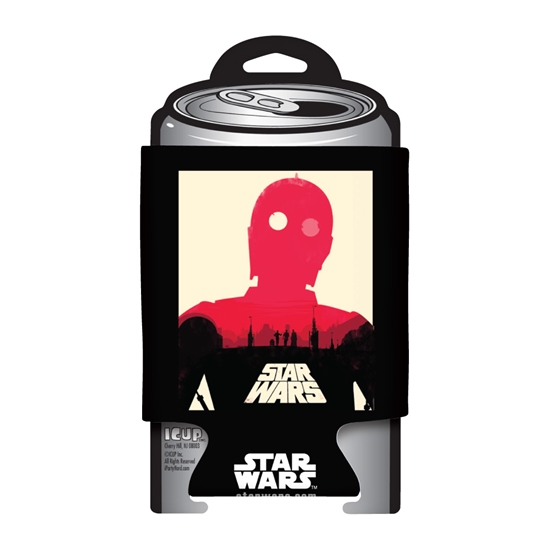 This is an illustrated insulated black neoprene drink can cooler huggie koozie featuring the poster image of C-3PO with the Star Wars Logo underneath. It is a new and unused licensed can cooler stored in a smoke and pet free environment.