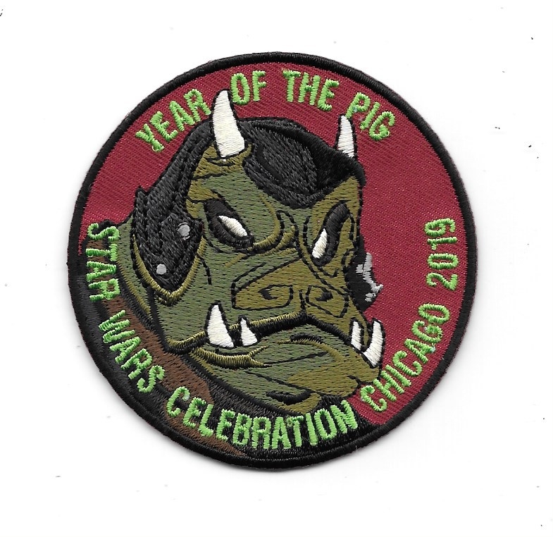 This mint, unused 3″ wide embroidered patch features the Year of the Pig logo with a Gamorrean Guard above the words “Star Wars Celebration Chicago 2019”. This is a limited SWAG patch produced for the 2019 Star Wars Celebration (IX) Convention held in Chicago and available only at the convention. It has a glue backing for easy application to hats, shirts, jackets and bags and is stored in a smoke and pet free environment.