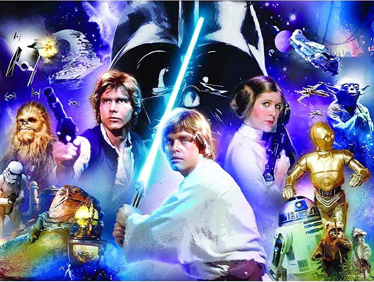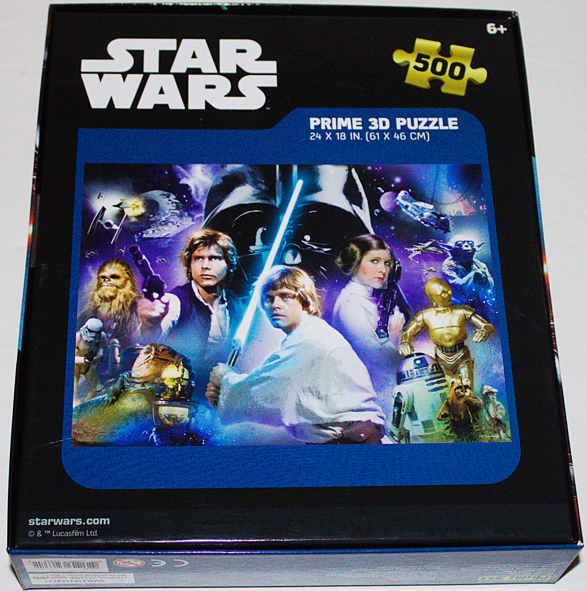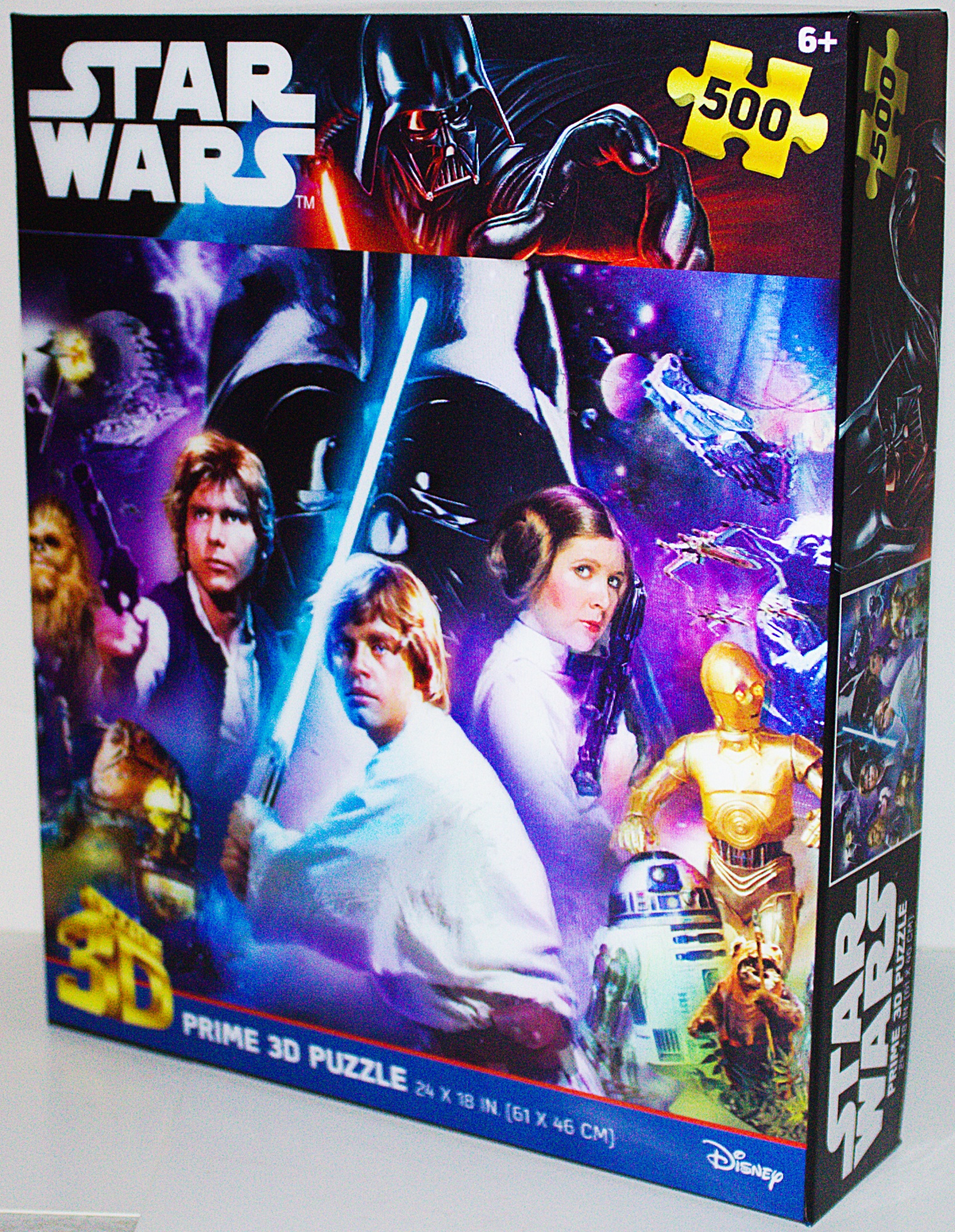 Produced by Prime 3D, this is a new, unused, sealed 500 piece 3D jigsaw puzzle featuring a collage of images of the classic characters from the original Star Wars trilogy, including Luke, Leia, Han Chewbacca, Darth Vader, R2-D2, C-3PO, Yoda, Jabba the Hutt and Wickett the Ewok, along with many of the ships and the Death Star. This puzzle measures 24″ x 18″ and is stored in a smoke and pet free environment.