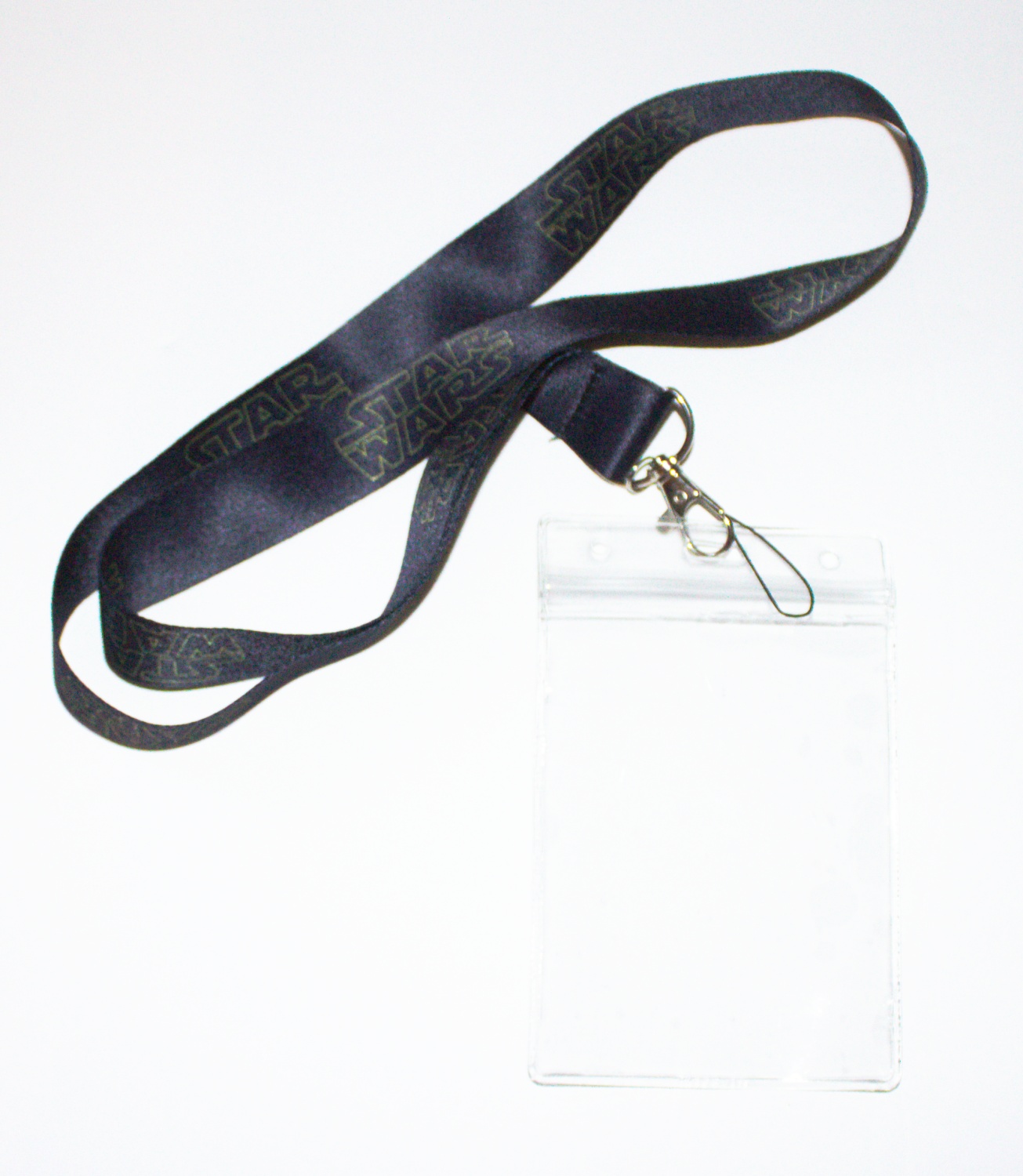This ia a 17″ long black lanyard that is covered with the images of the classic Star Wars name logo highlighted in yellow on both sides. It comes with a clear ID holder that is 2.75″ x 4″. It can be used to hold keys, name tags, and more. This is a new, unused lanyard stored in a smoke and pet free environment.