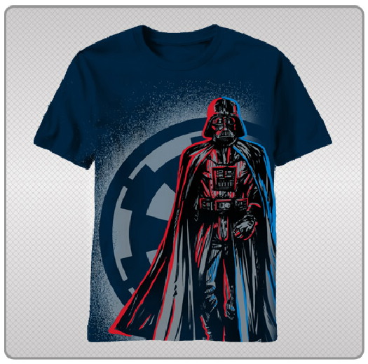 This is a navy blue t-shirt that features the full walking image of Darth Vader in front of the Imperial logo from the classic Star Wars movies. This is a new, never worn, t-shirt. It has been stored in a smoke and pet free environment.