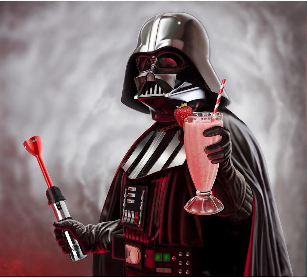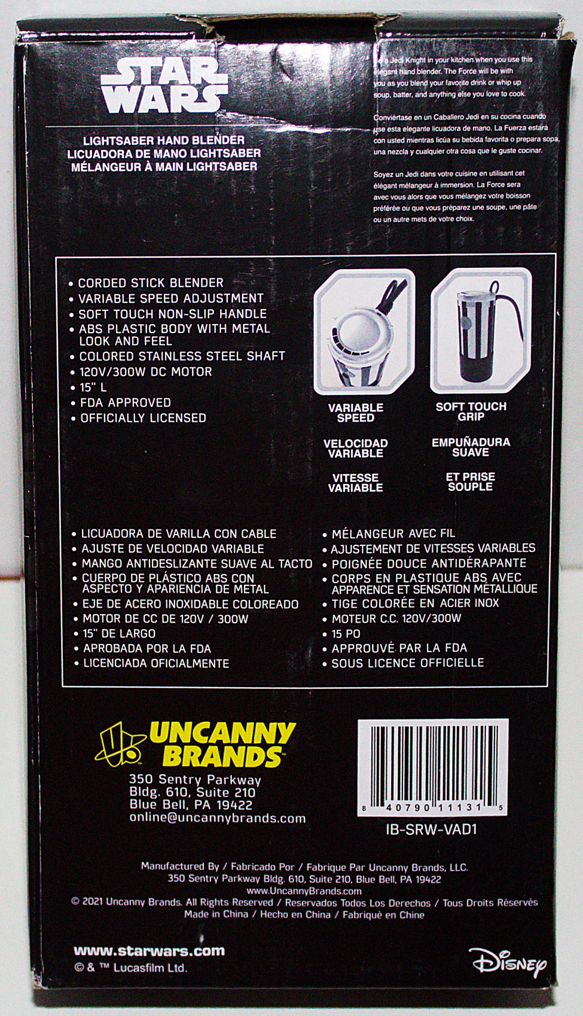 Produced Uncanny Brands this is a cordless 15″ long variable speed hand blender in the image of Darth Vader’s lightsaber. Adds the power of the Force to every meal! MAKE SOUP AND SMOOTHIES LIKE A SITH LORD- Great for easily making sauces, soups and smoothies. FEATURES – Corded stick blender with variable speeds. Soft touch, non-slip handle. ABS plastic body with metal look and feel. Colored stainless steel shaft detaches for easy cleaning. FURTHER DETAILS – 120 V/300 W DC motor. 15″ L. Food safety tested. The box shows some wear from the shipping to us from Uncanny Brands so we have lowered the price. It is a new, unused, sealed set stored in a smoke and pet free environment.