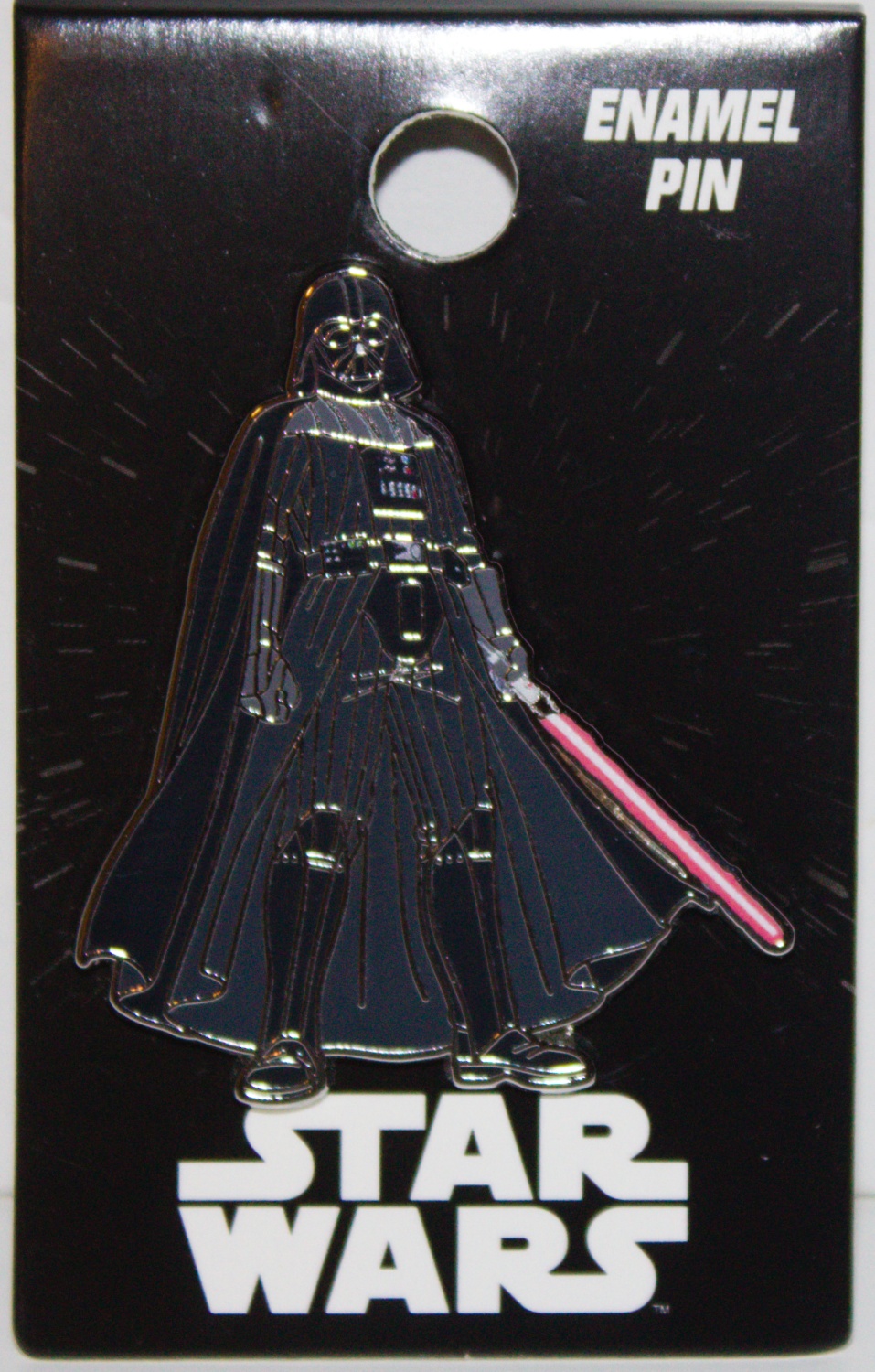 This new, unused enamel metal pin features the die-cut image of Darth Vader with his light saber out and on as seen in various Star Wars movies and TV series. It measures 2″ high x 1.5″ wide, has been stored in a smoke and pet free environment and comes with a clutch back pin for attachment.