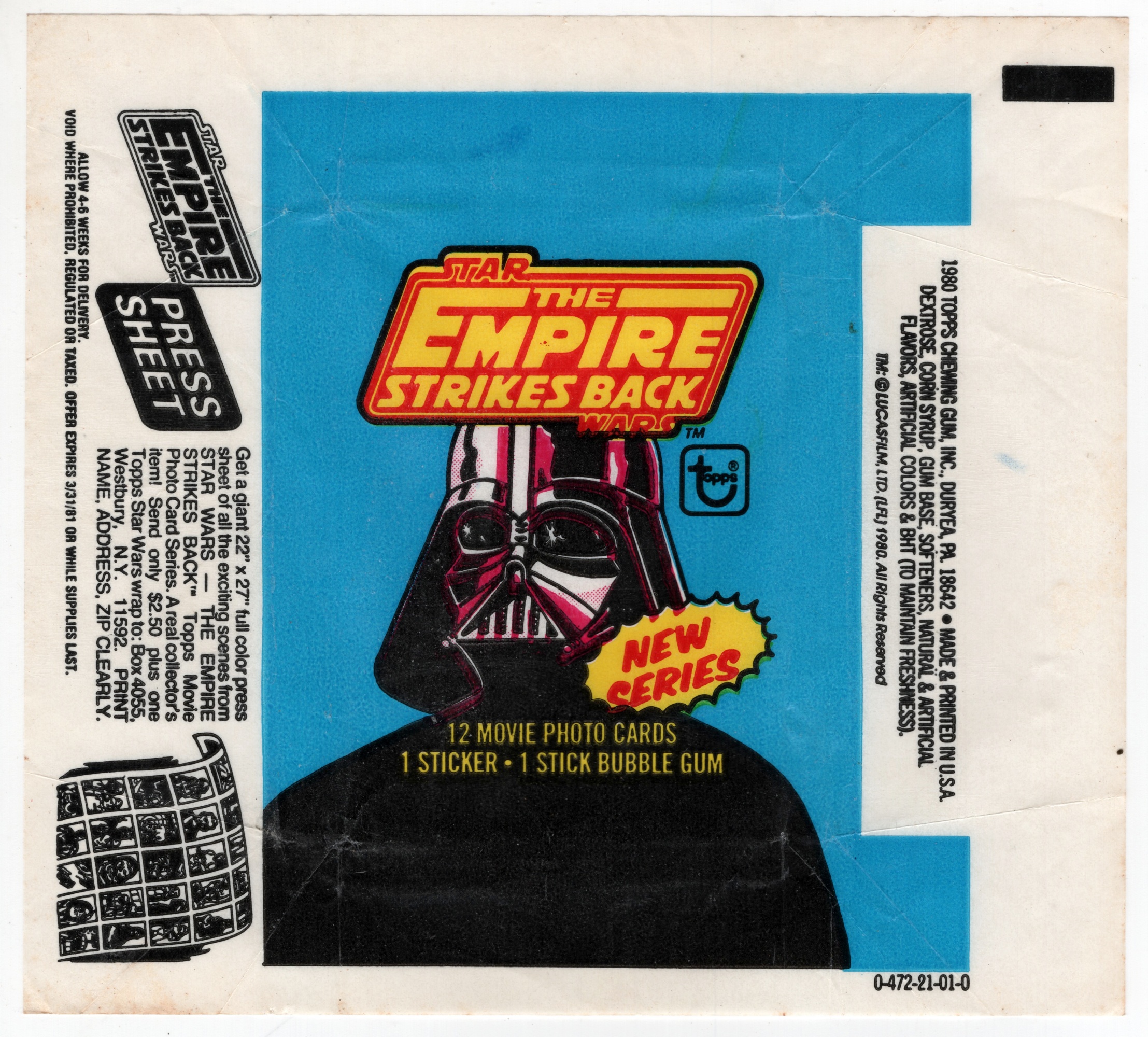 Released in 1980 by the Topps Company, this is a very nice condition wrapper from the second series of Star Wars Episode V: The Empire Strikes Back trading cards. It has no tears and is flat with only the normal creases from being used to hold the cards. This has been stored in a smoke and pet free environment since we acquired it in 1980. The photo is for identification but you will receive one in similar condition and it will be shipped in a protective sleeve.