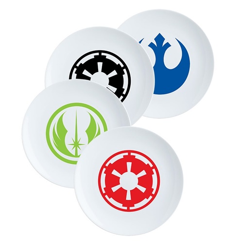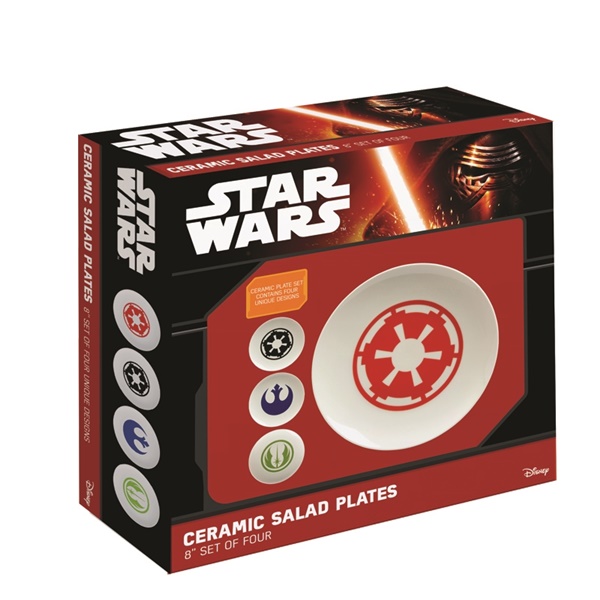 This is a set of four, 8 inch, ceramic salad plates that feature the logo designs of the rebel alliance, the jedi order, and the galactic empire from the hit series, Star wars. These plates feature a high quality design and are packed in an illustrated box. They are new, unused, dishwasher safe and stored in a smoke and pet free environment.