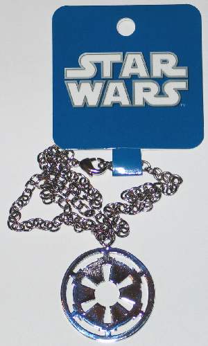 This is a licensed Star Wars necklace produced in 2011 that features the die-cut Imperial cog logo in silver tone. Cast in a silver metal zinc alloy, this is a new, unused pendant necklace with durable finish that measures 1 1/2″ wide with an 18″ silver toned chain. No longer being made, this is stored in a smoke and pet free environment.