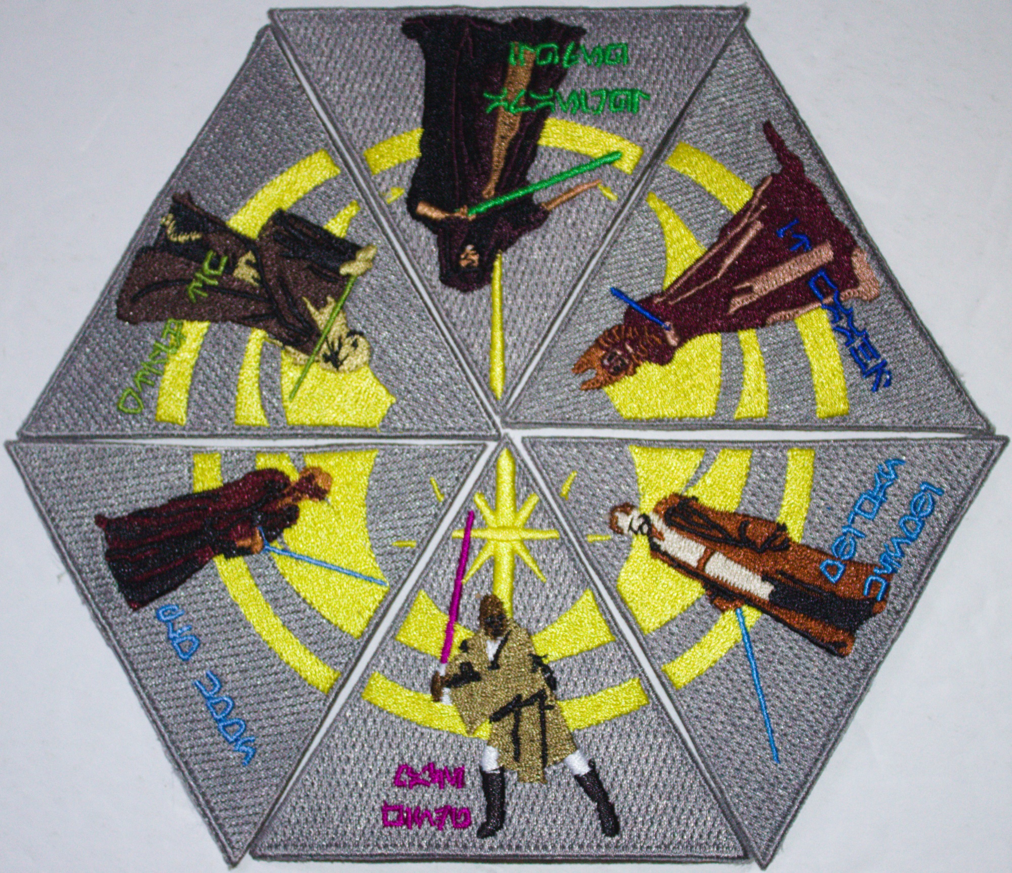 This new, embroidered set of six patches that features the images members of the Jedi Council with drawn lightsabers from the Star Wars movies. When put together they make a circle with the Jedi logo in the background. They include Mace Windu, Luminara Unduli, Kit Fisto, Plo Koon, Obi-Wan Kenobi and Shaak Ti. Individually they measures 3″ high x 3.5″ wide at the base and have been stored in a smoke and pet free environment. When grouped in order to form the Jedi Logo they measure 7″ wide and 6″ high. They come with a glue backing for easy application to a cloth surface.