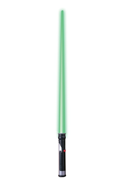 This is a licensed Qui-Gon Jinn lightsaber produced by Rubies that is designed as a costume toy. It is an injection molded plastic saber that features a green light-up telescoping blade that extends to over 3 feet in length. It is mint in a sealed blister and requires 2 AA batteries, not included, and has been stored in a smoke and pet free environment. As stated on the packaging “Product is a costume accessory and is not durable enough for battle or other play”.