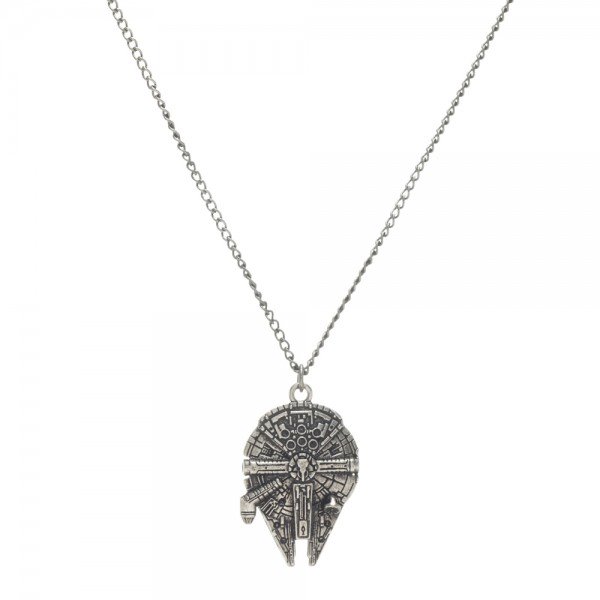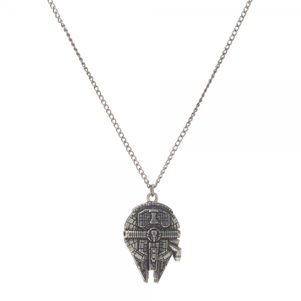 This is a licensed enamel grey/antique silver metal necklace in the 3-D image of the Millennium Falcon as seen in the classic Star Wars movies. It is a 3-D design with the ships detail on all sides (see photos) and measures 1.375″ across with an 18″ chain. It is in mint, unworn condition, in a sealed package and stored in a smoke and pet free environment.