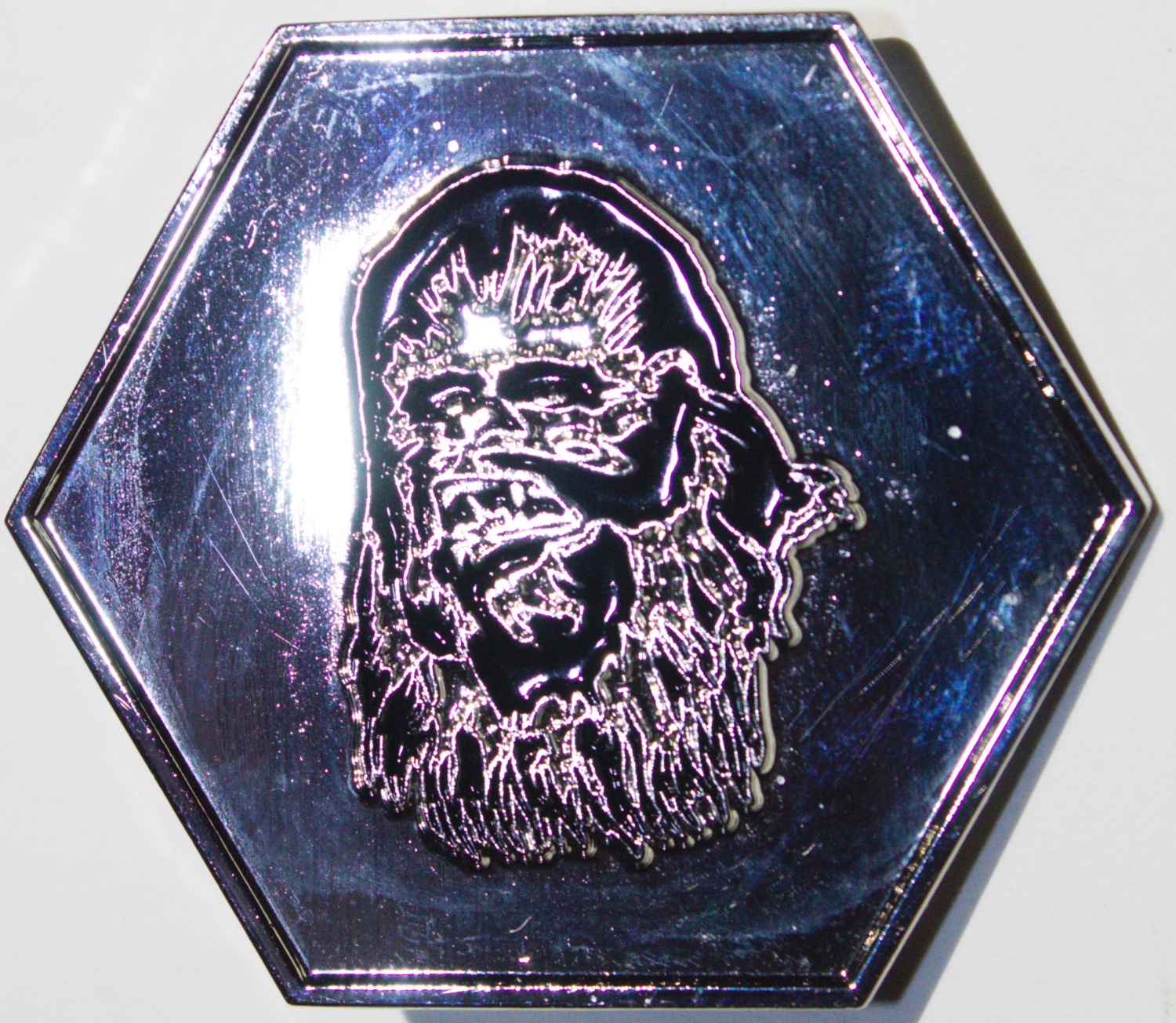 This is a new, metal enamel pin that features the image of the head / face of Chewbacca as seen in the classic Star Wars movies episodes IV, V and VI. This is a silver toned pin with the image cut into the pin in black giving it a 3D feel. It measures 1.75″ high x 2″ wide and has been stored in a smoke and pet free environment.
