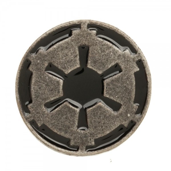 Produced in 2016, this is a .75″ wide black and grey metal enamel pin featuring the cog logo of the Imperial Empire from the classic Star Wars movies. This is a near mint, unused copy of this pin stored in a smoke and pet free environment.