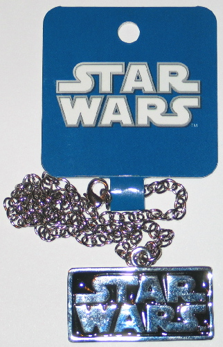 This is a licensed Star Wars necklace produced in 2011 that features the movie name in silver tone relief on black. Cast in a silver metal zinc alloy with shiny black enamel color added, this is a new, unused pendant necklace with durable finish that measures 2 1/16″ wide with an 18″ silver toned chain. It has been stored in a smoke and pet free environment.