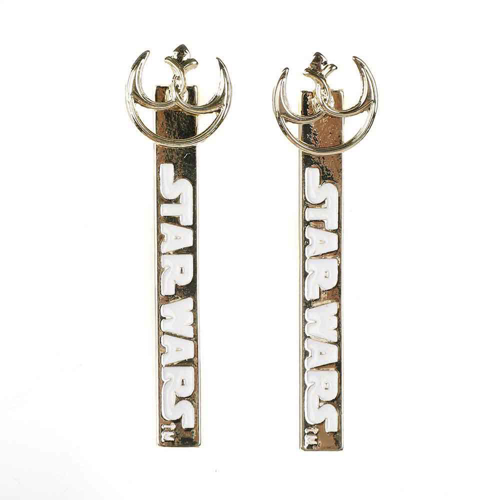 This is a pair of licensed pierced, drop earrings featuring the rebel alliance logo above the Star Name logo from the Star Wars universe. They are in mint, unworn condition and are produced by Bioworld and stored by us in a smoke and pet free environment.