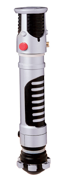 This is a licensed Obi-Wan Kenobi lightsaber produced by Rubies that is designed as a costume toy. It is an injection molded plastic saber that features a red light-up telescoping blade that extends to over 3 feet in length. It is mint in a sealed blister and requires 2 AA batteries, not included. No longer being made, it has been stored in a smoke and pet free environment. As stated on the packaging “Product is a costume accessory and is not durable enough for battle or other play”.