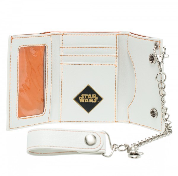 This is a metal badge wallet featuring the character images of Chewbacca, Han Solo and the Rebel Alliance logo on the outside with a white interior from the classic Star Wars movies. It is a new, unused wallet stored in a smoke and pet free environment.