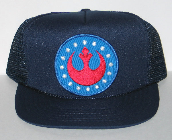 This is a BLUE cloth adjustable baseball style(meaning a round bill) hat (made of 65% polyester and 35% cotton) with a 100% polyester mesh back with the Star Wars Rebel Alliance New Republic logo patch attached to the front. This is a new, never worn hat stored in a smoke and pet free environment.