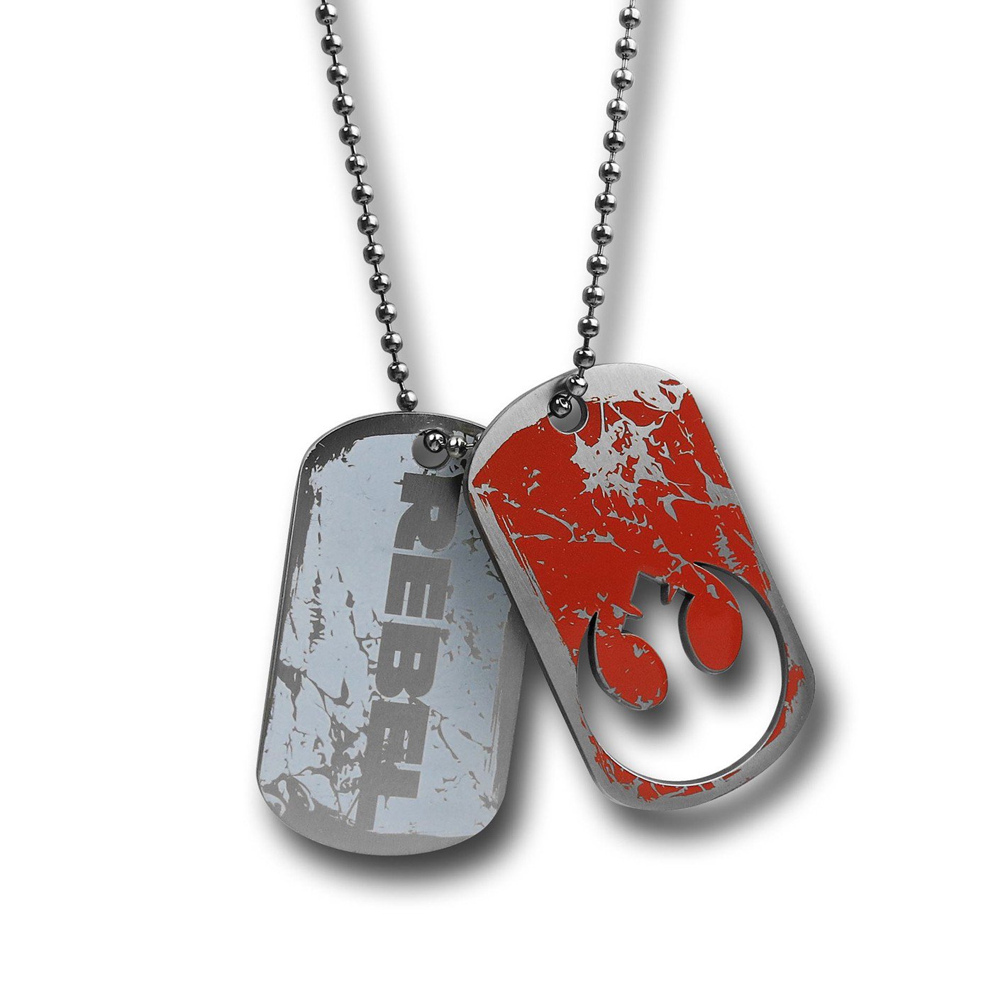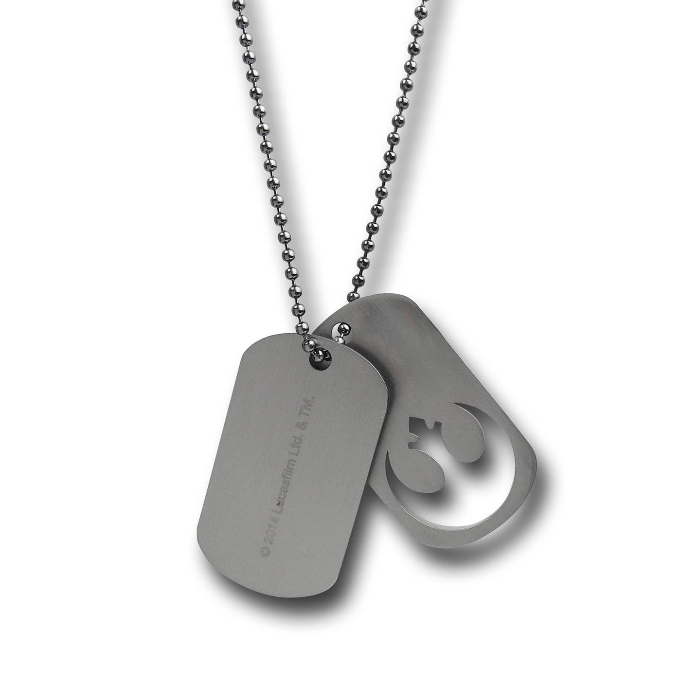 This is a licensed metal set of dog tags that features the die cut image of the Rebel/ Rebellion logo as seen in the Star Wars movies. It is in mint, unworn condition with a 24″ chain, produced by Bioworld. No longer being made, it is in a sealed package and stored in a smoke and pet free environment.