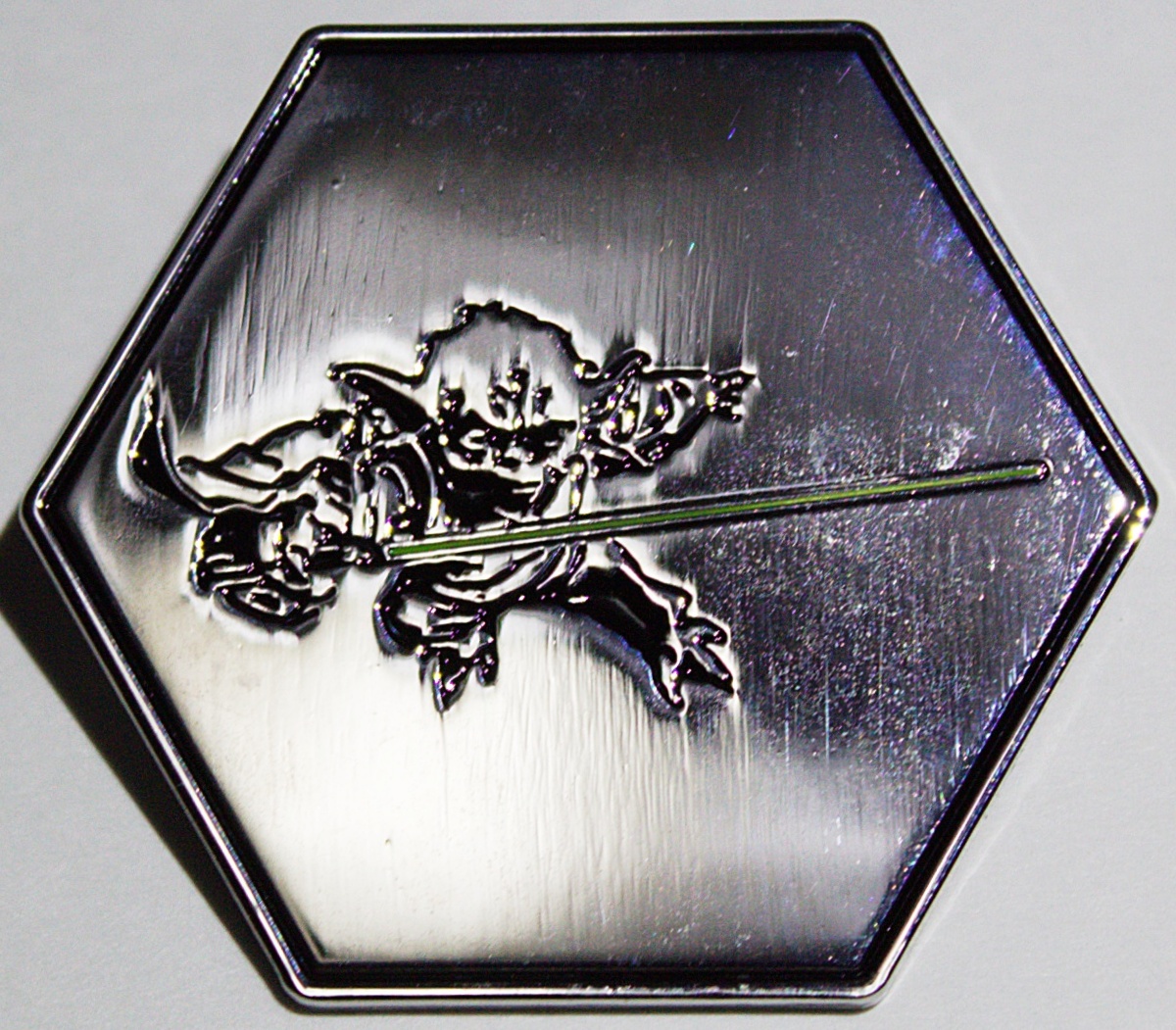 This is a new, metal enamel pin that features the image of a leaping Yoda with his lightsaber in a scene from the Star Wars movie Episode III: Revenge of the Sith. It measures 1.75″ high x 2″ wide and has been stored in a smoke and pet free environment.
