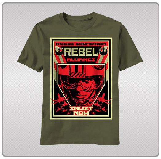 This is a military green t-shirt that features a recruitment style poster image of a rebel fighter surrounded by the words Rouge Squadron Rebel Alliance Enlist Now. This is a new, unused, 100% cotton t-shirt. It has been stored in a smoke and pet free environment.