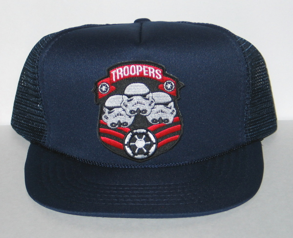 This is a BLACK cloth adjustable baseball style (meaning a round bill) hat (made of 65% polyester and 35% cotton) with a 100% polyester mesh back. It has the Star Wars Storm Trooper Logo Banner patch attached to the front. This is a new, never worn hat stored in a smoke and pet free environment.