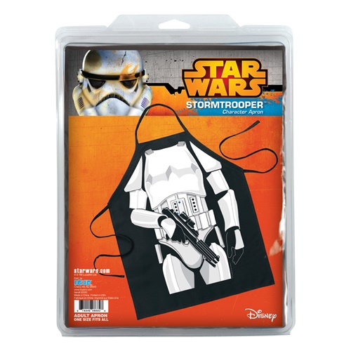 This is a black polyester adult apron featuring the image of a stormtrooper’s armored body as seen in the classic Star Wars movies. This is a new, unworn adjustable apron still in its original packaging stored in a smoke and pet free environment.