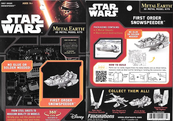 This amazingly detailed model starts as 4″ square sheets and finishes as a 3-D model. It is approximately 2.75″ tall when assembled and this one features First Order Snowspeeder as first seen in the new Star Wars movie Episode VII: The Force Awakens. The sheets contain detailed laser etching for easy removal. Complete instructions are included to show you how to pop out the pieces, bend the tabs, and connect them at the attachment points with an average assembly time of 30-45 minutes. It has been stored in a smoke and pet free environment. We also offer an optional LED base or a Solar Powered Spinner for better display of your model.