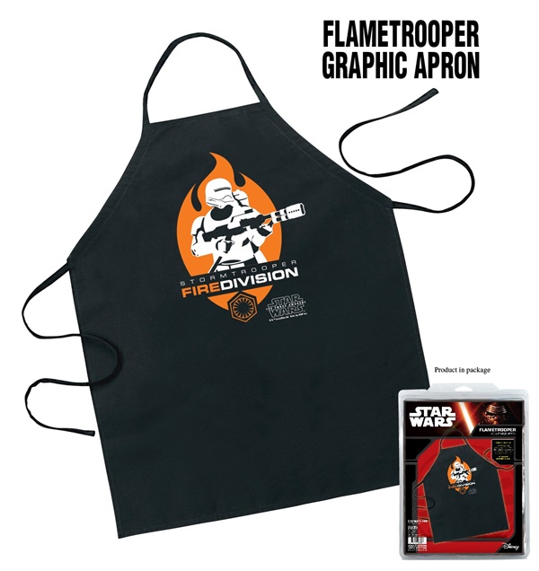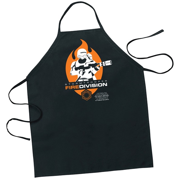 This is a black polyester adult apron featuring the image of a Flametrooper, part of the StormTrooper Fire Division of the First Order as seen in the Star Wars movie The Force Awakens. It also features the First Order logo and the movie logo. This is a new, unworn adjustable apron still in its original packaging stored in a smoke and pet free environment.