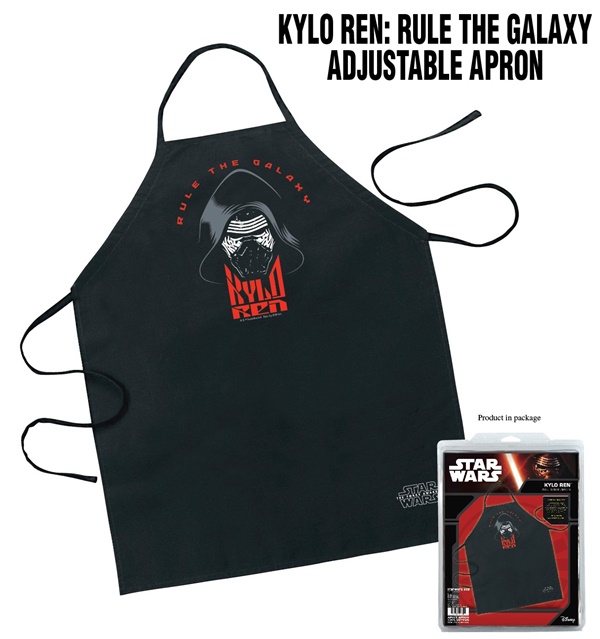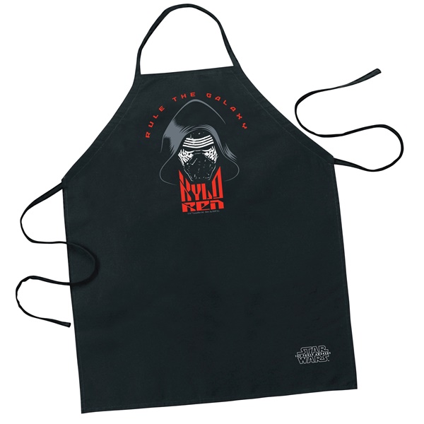 This is a black polyester adult apron featuring the image of the head and mask of Kylo Ren above his name as seen in the Star Wars movie The Force Awakens. It also features the phrase “Rule the Galaxy” at the top. This is a new, unworn adjustable apron still in its original packaging stored in a smoke and pet free environment.