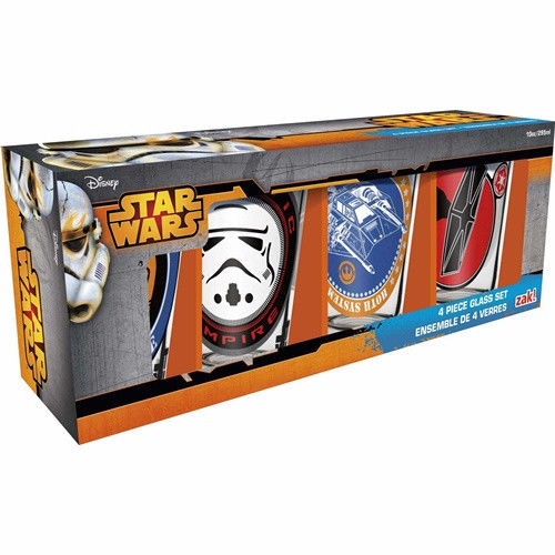 Share your love for Star Wars with this gift set of collectible juice glasses! These four glasses, two each of two different designs, are an attractive addition to any household, whether it’s at the table, on a shelf, or even in a display case. The full coverage art is bright and vibrantly colored, an eye-catching statement from any angle. Both decorative and functional, they’re also great for everyday use, with a 10-ounce capacity and an easy-to-hold cone shape. When it’s time to clean up, they stack nicely for easy, space-saving storage. And don’t worry over the delicate handling of fragile materials: the thicker glass reduces chances of breakage. Everything comes in a fully decorated box that’s easy to wrap and transport ā the perfect gift for any occasion. These glasses are completely BPA free and should be washed by hand. They’re not recommended for the dishwasher or microwave. These are stored in a smoke and pet free environment.