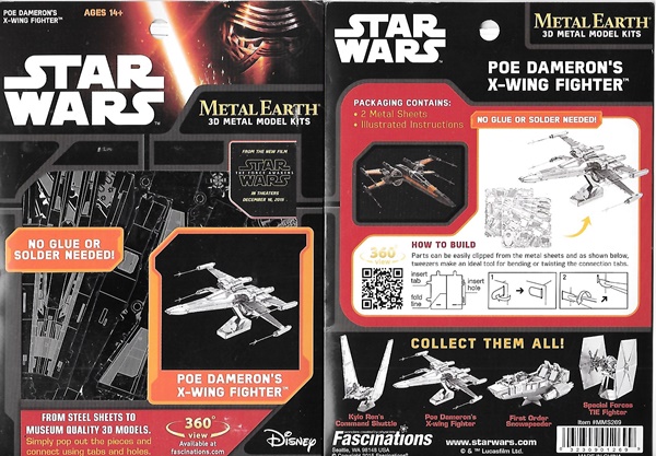 This amazingly detailed model starts as 4″ square sheets and finishes as a 3-D model. It is approximately 2.75″ tall when assembled and this one features Poe Dameron’s X-Wing Fighter as first seen in the new Star Wars movie Episode VII: The Force Awakens. The sheets contain detailed laser etching for easy removal. Complete instructions are included to show you how to pop out the pieces, bend the tabs, and connect them at the attachment points with an average assembly time of 30-45 minutes. It has been stored in a smoke and pet free environment. We also offer an optional LED base or a Solar Powered Spinner for better display of your model.