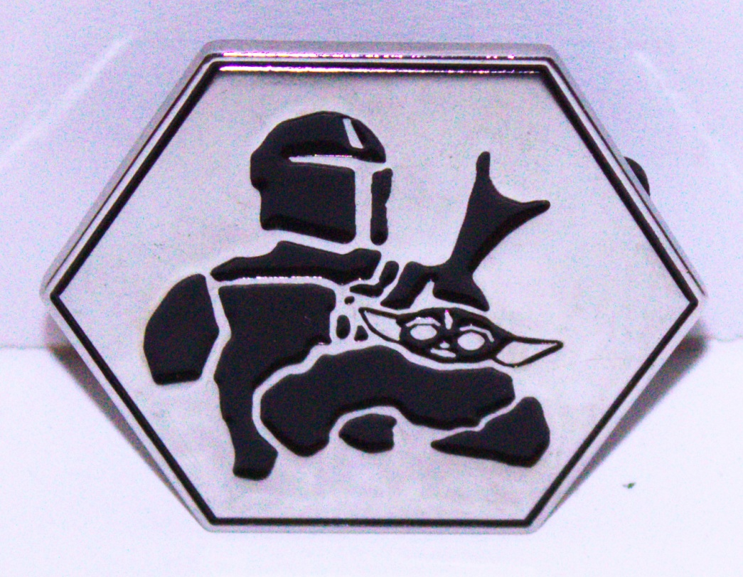 This new, metal enamel pin that features the debossed silhouette image of Mando holding the Child Grogu in a scene from the Star Wars TV series The Mandalorian. It measures 1.75″ high x 2″ wide and has been stored in a smoke and pet free environment.