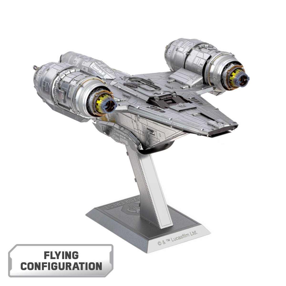 This amazingly detailed model starts as two and 5/8 8.3″ x 4.3″ metal sheets and finishes as a 3-D model. Build your very own Razor Cres Metal Earth® Premium Series model inspired from The Mandalorian series! Each Premium Series kit is made from high quality steel sheets and features amazing detail. Easy to follow instructions are included in each kit and no glue or solder required! Simply snip out the pieces and bend the tabs through corresponding connection points. It is approximately 5.51″ long by 3.62″ wide by 3.07″ high when assembled and is challenging level of difficulty and will take 60 minutes or more to complete. The sheets contain detailed laser etching for easy removal. Complete instructions are included to show you how to pop out the pieces, bend the tabs, and connect them at the attachment points. It has been stored in a smoke and pet free environment. We also offer an optional LED base or a Solar Spinner for better display of your model.