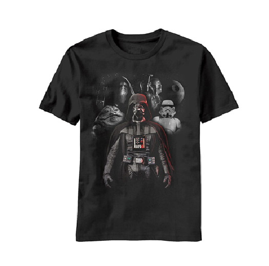 This is a black t-shirt that features the collage of Darth Vader, Boba Fett, Jabba the Hutt, the Emperor and StormTroopers and titled Dark Guys. This is a new, unused, 100% cotton t-shirt. It has been stored in a smoke and pet free environment.