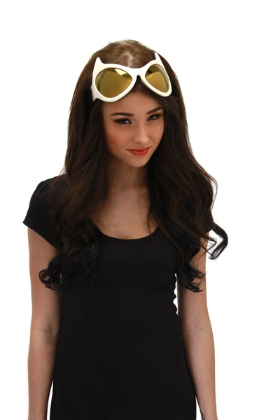 This is a set of white framed cat eye style goggles/glasses, with gold toned lenses, perfect for costuming, especially for the popular steampunk genre. The goggles come with an adjustable elastic strap and UV400 lenses . This is a new, unused set of goggles. They have been stored in a smoke and pet free environment.