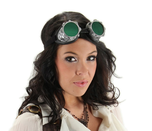 This is a set of CyberSteam goggles, perfect for costuming, especially for the popular steampunk genre. The goggles come with an adjustable elastic strap and green tinted UV400 lenses with a mirror finish. The plastic frame is a silver and black distressed finish with padded foam on the inside of the frame for a more comfortable fit. This is a new, unused set of goggles. We also sell the pendant seen in the photo. This has been stored in a smoke and pet free environment.