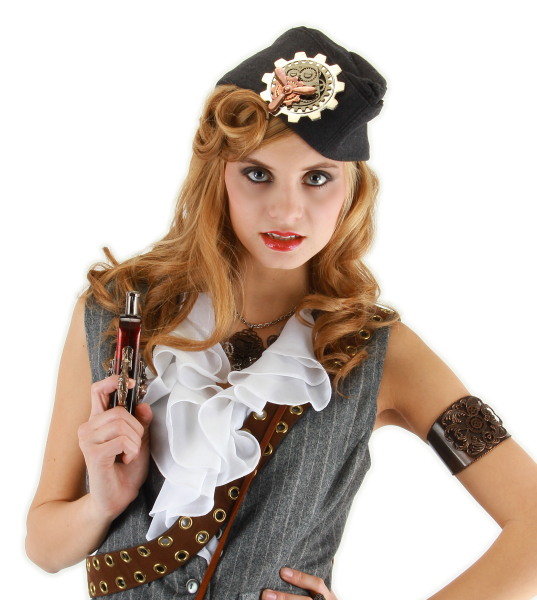 This is an adult naval officer period style hat that is perfect for costuming, especially for the popular steampunk genre or cosplay. It fits average size adult heads, measuring approximately 11.875″ x 5.125″ and comes in either grey or brown though this auction is for grey. The dragonfly pin shown on the hat, necklace and arm band are sold separately as an accessory which we also have available in our store. This is a new, unused hat, made of 100% felt polyester. It has been stored in a smoke and pet free environment.