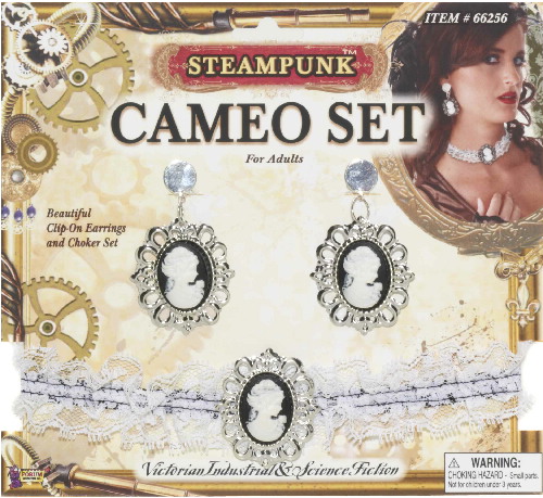 This is a new, unused, Victorian style set of cameo earrings and cameo lace choker, for use in Cosplay or SteamPunk. The earrings feature a Victorian Lady’s silhouette set on a black oval with an antique detailed border and the choker features the same charm mounted on a black and white, ruffled lace choker. It is sealed in its original illustrated packaging. This item has been stored in a smoke and pet free environment.