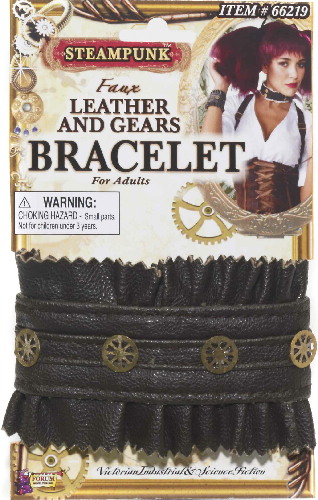 This is a new, unused, Victorian style bracelet 2 1/4″ wide for use in Cosplay or SteamPunk. It has a velcro closure to adjust for wrist size, with small gears on it. it is made of PVC to give it a Faux leather look. It is sealed in its original illustrated packaging. It has been stored in a smoke and pet free environment.