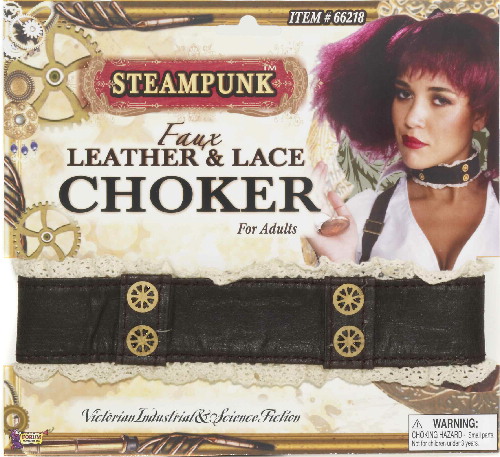 This is a new, unused, Victorian style choker necklace 1 1/2″ wide for use in Cosplay or SteamPunk. It has a silver buckle on the back to adjust for neck size, with small gears on it and edged with lace. it is made of 50% cotton and 50% PVC to give it a Faux leather look. It is sealed in its original illustrated packaging. It has been stored in a smoke and pet free environment.