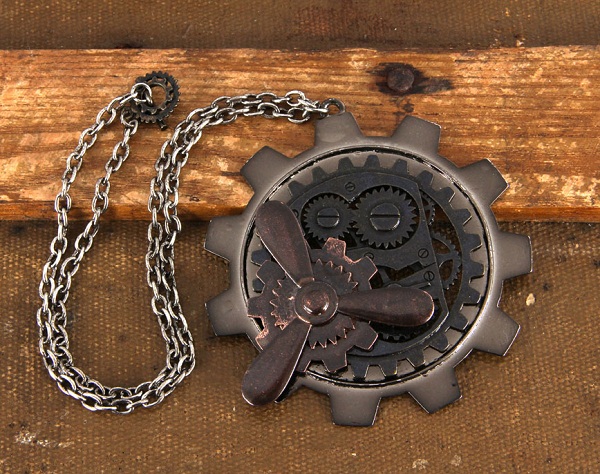 This is a new, unused, Victorian style large circular gear chain necklace with a large propeller and gear on the edge, for use in Cosplay or SteamPunk. It is metal 3 1/2″ wide in antique black with a black gear toggle closure. With an 20″ long silvertone chain, it is sealed in its original illustrated packaging. It has been stored in a smoke and pet free environment.