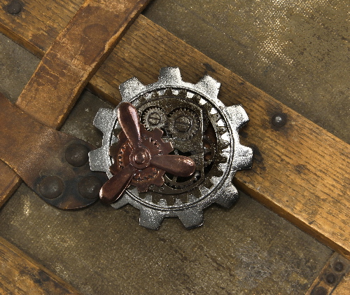 This is a new, unused, Victorian style metal large gear shaped pin, measuring 3.25″ wide covered in gears, a safety pin style back and colored in antique brass. It is metal and it is sealed in its original illustrated packaging. This is stored in a smoke and pet free environment.
