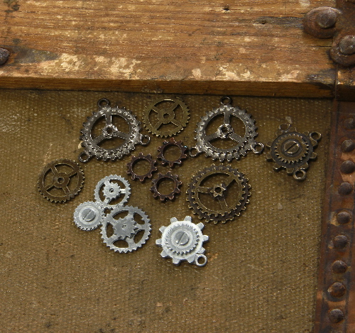 This is a sealed bag of Victorian style industrial gears of different sizes (ranging from 3/8″ to 1″ in diameter), styles and colors to embellish your SteamPunk costume and accessories.